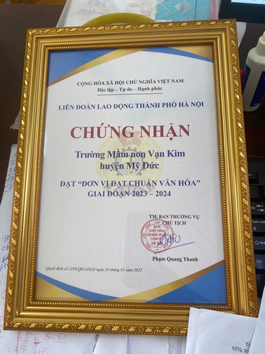 Lượt xem:6 Giấy Chứng nhận đơn vị Đạt chuẩn cơ quan văn hóa Chia s? Tải về Thông tin tài liệu Giấy Chứng nhận đơn vị Đạt chuẩn cơ quan văn hóa Hình ảnh Trường Mầm non Vạn Kim vinh dự nhận Giấy chứng nhận Đơn vị đạt chuẩn Cơ quan văn hóa là minh chứng rõ nét cho những nỗ lực bền bỉ của tập thể cán bộ, giáo viên và nhân viên nhà trường trong việc xây dựng môi trường sư phạm văn minh, kỷ cương và thân thiện. Danh hiệu cao quý này không chỉ khẳng định sự phát triển toàn diện về cơ sở vật chất, cảnh quan sư phạm và nếp sống văn hóa trong nhà trường, mà còn là động lực để tập thể tiếp tục duy trì và phát huy những giá trị tốt đẹp, góp phần nâng cao chất lượng giáo dục và lan tỏa hình ảnh đẹp của ngôi trường trong cộng đồng địa phương.