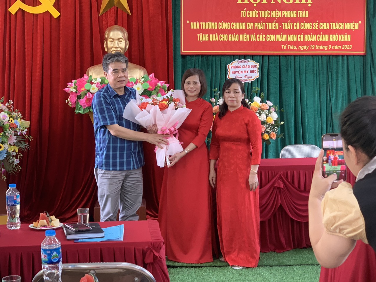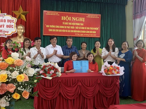 Lượt xem:331 HỘI NGHỊ " NHÀ TRƯỜNG CÙNG CHUNG TAY PHÁT TRIỂN - THẦY CÔ CÙNG SẺ CHIA TRÁCH NHIỆM" Chia s? HỘI NGHỊ " NHÀ TRƯỜNG CÙNG CHUNG TAY PHÁT TRIỂN - THẦY CÔ CÙNG SẺ CHIA TRÁCH NHIỆM" DẤU ẤN! Thực hiện Phong trào "Nhà trường cùng chung tay phát triển - Thầy cô cùng sẻ chia trách nhiệm" của Phòng GD&ĐT huyện Mỹ Đức. Chiều 19 tháng 9 năm 2023 hai nhà trường Mầm non Tế Tiêu và trường mầm non Vạn Kim long trọng tổ chức Hội nghị thực hiện phong trào "Nhà trường cùng chung tay phát triển - Thầy cô cùng sẻ chia chia trách nhiệm - Tặng quà cho con giáo viên học sinh hoàn cảnh đặc biệt khó khăn". Về dự và chỉ đạo hội nghị có các đồng chí chuyên viên Phòng Giáo dục và Đào tạo huyện Mỹ Đức; lãnh đạo chính quyền địa phương của hai xã thị trấn Đại Nghĩa và xã Vạn Kim; cùng sự có mặt đông đủ của Ban chi ủy Chi bộ, Ban giám hiệu, Ban chấp hành Công đoàn, BCH Đoàn TNCS Hồ Chí Minh, Tổ trưởng tổ phó các khối giáo viên - nhân viên cốt cán, đặc biệt là sự có mặt của bốn cháu có hoàn cảnh đặc biệt khó khăn được trao quà của hai nhà trường cũng có mặt đông đủ. Hội nghị diễn ra trong không khí vui tươi đầm ấm thể hiện sự gắn kết trao đổi, chia sẻ đầy trách nhiệm, thể hiện sự đoàn kết thống nhất hai nhà trường tại cam kết bảng ghi nhớ phong trào......" Tải về Thông tin tài liệu HỘI NGHỊ " NHÀ TRƯỜNG CÙNG CHUNG TAY PHÁT TRIỂN - THẦY CÔ CÙNG SẺ CHIA TRÁCH NHIỆM"