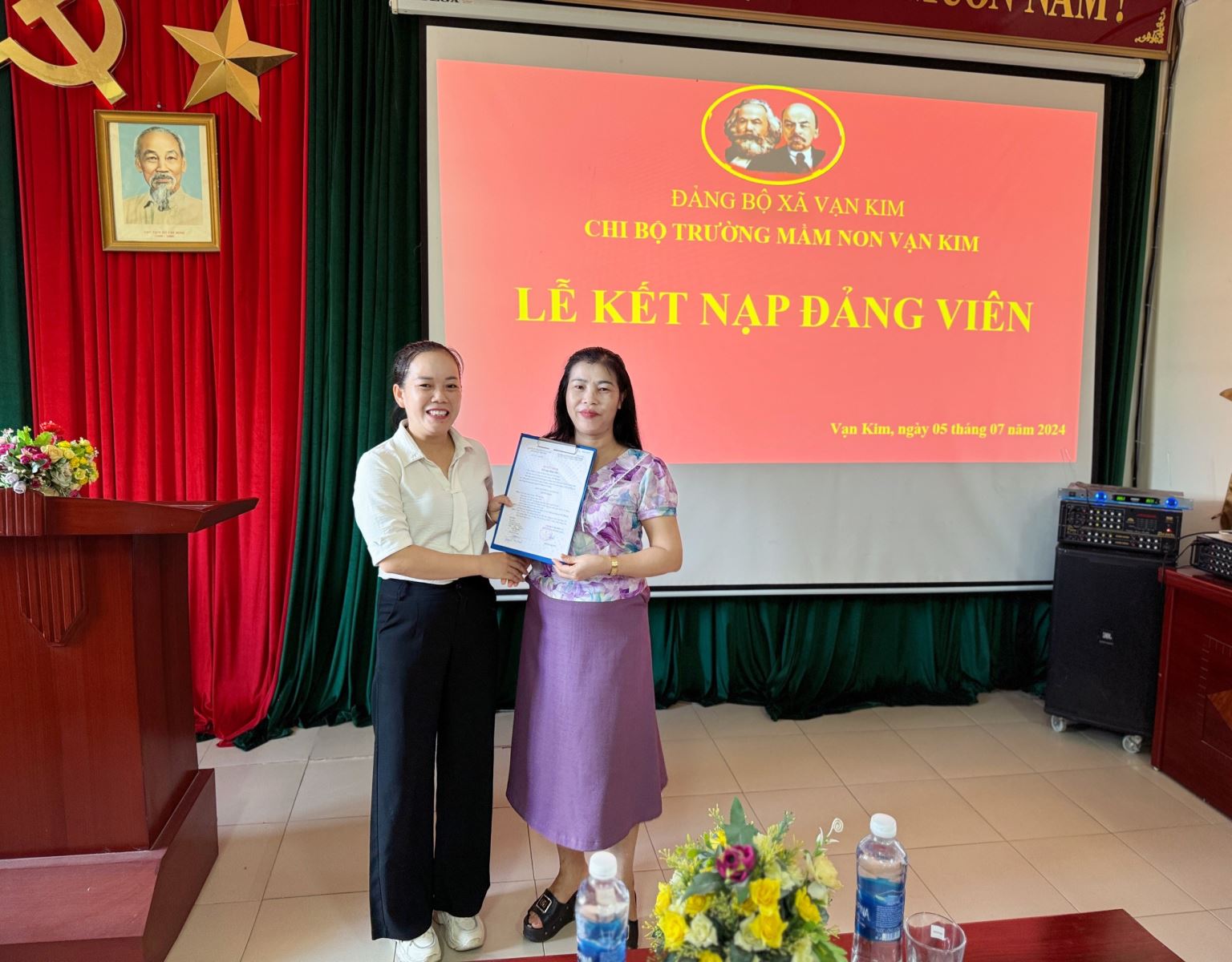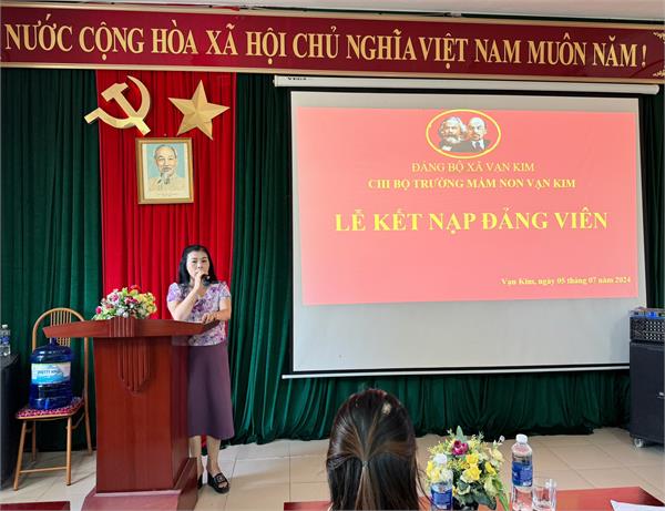 Lượt xem:292 LỄ KẾT NẠP ĐẢNG VIÊN MỚI Chia s? CHI BỘ TRƯỜNG MẦM NON VẠN KIM KẾT NẠP ĐẢNG VIÊN MỚI Thực hiện Nghị quyết Đại hội Chi bộ Trường mầm non Vạn Kim về việc phát triển Đảng viên. Ngày 05/07/2024, Chi bộ trường Trường mầm non Vạn Kim đã long trọng tổ chức lễ kết nạp Đảng viên mới đối với 2 quần chúng ưu tú: Vũ Thị Lai và Trịnh Thị Thanh. Đây là sự kiện có ý nghĩa quan trọng trong công tác xây dựng Đảng, góp phần phát triển, nâng cao chất lượng và sức chiến đấu của Chi bộ trường nói chung và các cá nhân Đảng viên nói riêng. Lễ kết nạp diễn ra theo đúng trình tự, thủ tục điều lệ Đảng dưới sự chủ trì của đồng chí Nguyễn Thị Thám – Bí thư Chi bộ, Hiệu trưởng nhà trường cùng tập thể Ban Chi ủy và đông đủ các đảng viên trong Chi bộ. Để vinh dự đứng trong hàng ngũ của Đảng, đồng chí Vũ Thị Lai và đồng chí Trịnh Thị Thanh dưới sự dìu dắt của nhà trường, chi bộ Đảng trường mầm non Vạn Kim đã không ngừng phấn đấu, rèn luyện trong quá trình học tập, tu dưỡng đạo đức theo lý tưởng, tôn chỉ của Đảng Cộng sản Việt Nam, lấy tư tưởng Hồ Chí Minh làm kim chỉ nam cho mọi hành động. Là một Đảng viên mới, đồng chí càng ý thức rõ hơn về trách nhiệm của bản thân đối với gia đình, xã hội và Nhà trường. Đây là sự kiện đánh dấu một bước ngoạt đối với đảng viên trẻ Vũ Thị Lai và Trịnh Thị Thanh Trong không khí trang nghiêm khi nhận quyết định từ Bí thư Chi bộ, dưới cờ Đảng, cờ Tổ quốc và chân dung Chủ tịch Hồ Chí Minh cùng sự chứng kiến của Chi bộ, đồng chí Vũ Thị Lai và Trịnh Thị Thanh đã tuyên thệ lời thề của người đảng viên Đảng Cộng sản Việt Nam, hứa sẽ tiếp tục phấn đấu để luôn xứng đáng là người đảng viên gương mẫu, hoàn thành tốt mọi nhiệm vụ được giao, góp phần xây dựng Chi bộ ngày càng vững mạnh. Phát biểu tại Lễ kết nạp Đảng viên Đồng chí Nguyễn Thị Thám – Bí thư Chi bộ đã phân công nhiệm vụ cho đảng viên mới và chúc mừng đồng chí Vũ Thị Lai và Trịnh Thị Thanh, sau một thời gian được bồi dưỡng, thử thách đã được vinh dự đứng trong hàng ngũ của Đảng Cộng sản Việt Nam. Bồi dưỡng, kết nạp đảng viên mới là nhiệm vụ thường xuyên được Chi bộ Trường mầm non Vạn Kim rất quan tâm. Việc giáo viên, nhân viên trẻ được kết nạp vào Đảng đã khẳng định sự cố gắng trong học tập, tu dưỡng, rèn luyện của các đồng chí . Đây chính là những tấm gương sáng để các giáo viên, nhân viên trẻ tiếp theo của Trường mầm non Vạn Kim noi theo. Buổi lễ kết nạp Đảng viên đã diễn ra trong không khí trang nghiêm, đúng trình tự, thủ tục của Điều lệ Đảng. Một số hình ảnh diễn ra trong Lễ kết nạp Đảng viên mới: Tải về Thông tin tài liệu LỄ KẾT NẠP ĐẢNG VIÊN MỚI CHI BỘ TRƯỜNG MẦM NON VẠN KIM KẾT NẠP ĐẢNG VIÊN MỚI