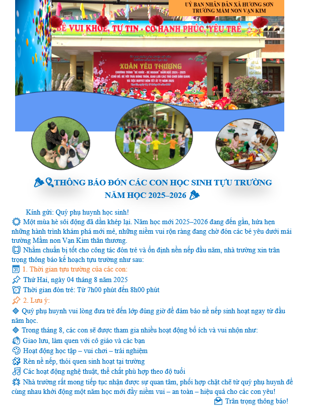 Lượt xem:11 Thông báo ngày Tựu trường của các con học sinh năm học 2025-2026 Chia s? Tải về Thông tin tài liệu Thông báo ngày Tựu trường của các con học sinh năm học 2025-2026