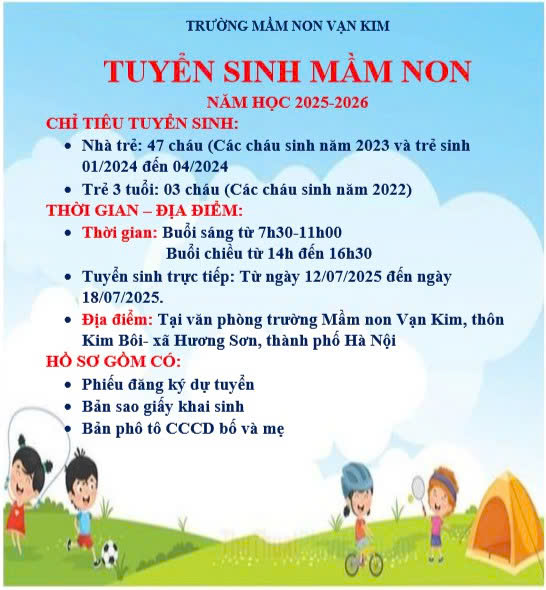 Lượt xem:90 TRƯỜNG MẦM NON VẠN KIM THÔNG BÁO TUYỂN SINH NĂM HỌC 2025-2026 Chia s? Tải về Thông tin tài liệu TRƯỜNG MẦM NON VẠN KIM THÔNG BÁO TUYỂN SINH NĂM HỌC 2025-2026